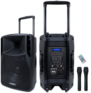 1 st KAM RZ12A-BT 250 riktiga Watt. USB-spelare. FM-radio. Trådlös fjärrkontroll. 2 trådlösa mikrofoner. Karaoke-funktion och eko. Mixer - mixa mickar och musik. Teleskophandtag. Stativfäste. Laddas från 230V. Starkt MC-batteri inbyggt. 12V utgång. Utgång till sub. EQ. Ingångar för gitarr och fler mickar. 2 antenner. Ingångar för SD-kort och USB-sticka. iPad iPhone Smarthone PC Mac kan anslutas både trådlöst och med RCA. Bra bastryck, 12" PA-bas med både kickbas och djup.