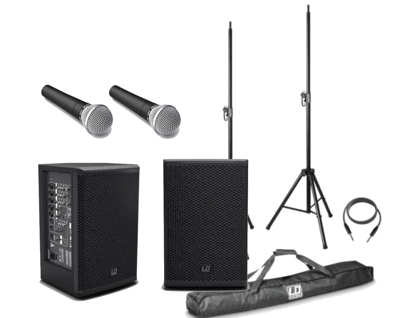 LD Mix10A SET - PA-system, 2x 10-tum, integrerad mixer, 2x400W, 124 dB, 65-20000 Hz, 12.3 kg. | 2st högtalarstativ | 2st Shure SM58 + kabel