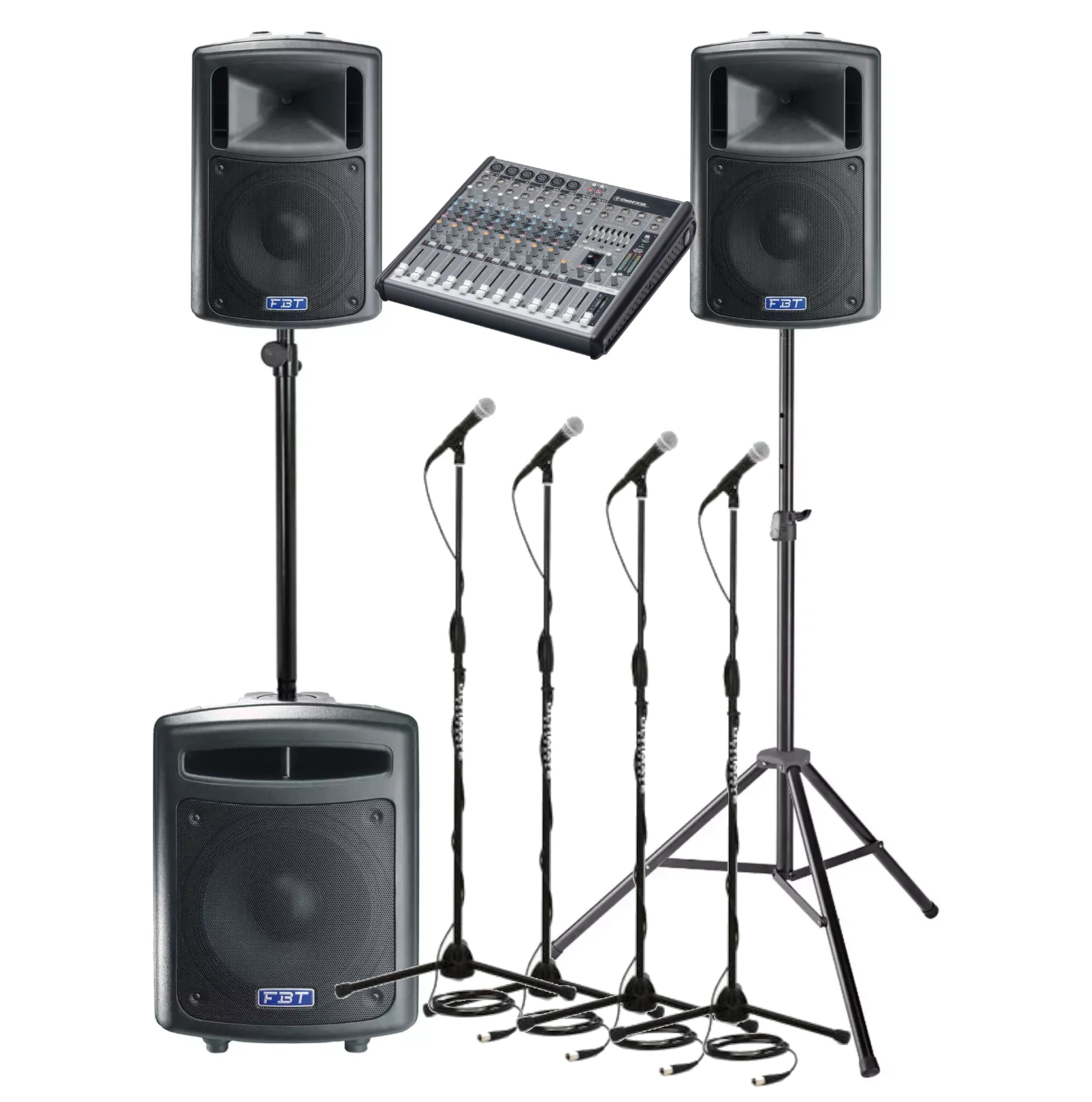 2 st FBT MAXX 2A aktiva högtalare, 500watt | 1 st Mackie FX 12 mixer, 6 x Mikrofoningång | 2 st Högtalarstativ | 4 st Mikrofoner | 4 st Mikrofonstativ
